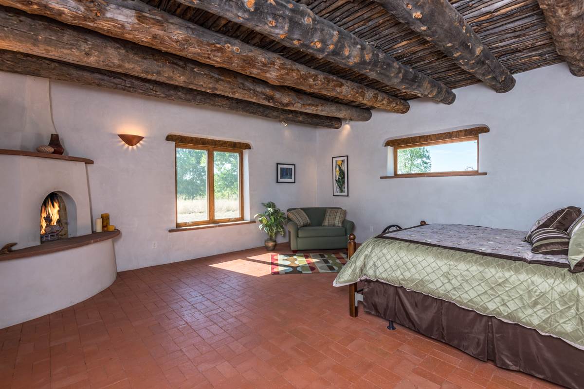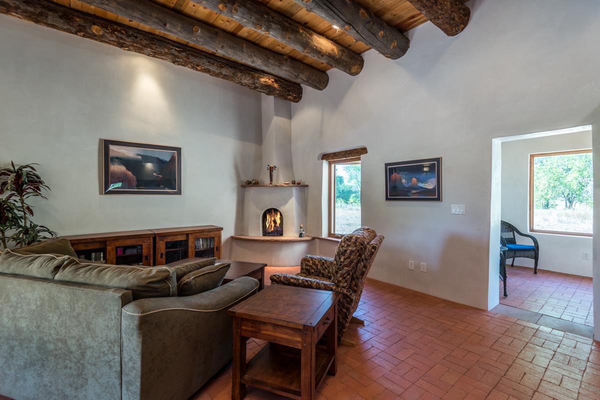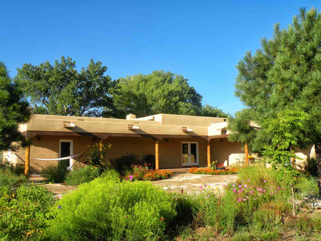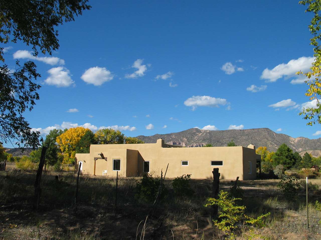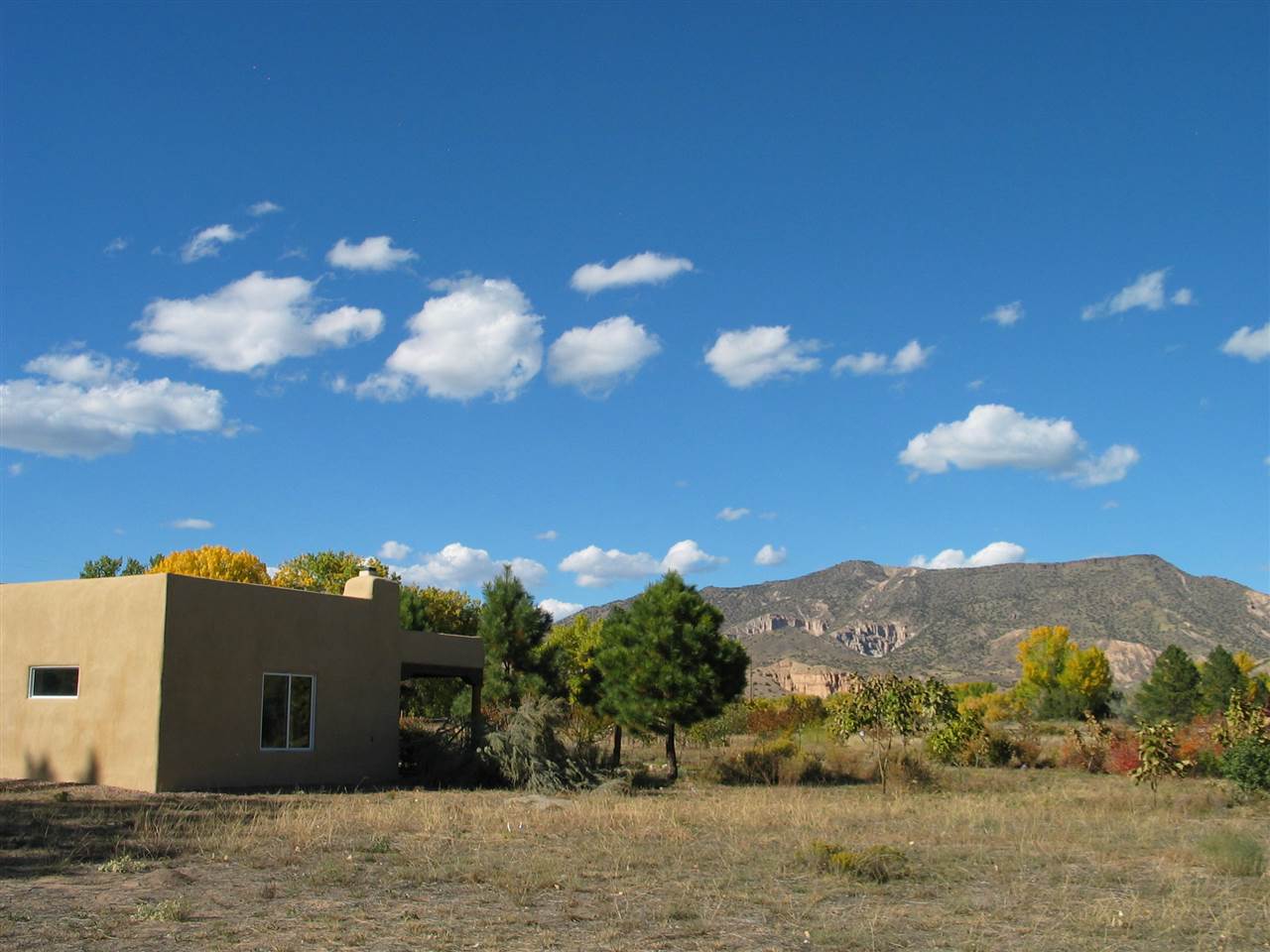 This striking single level Abiquiu residence set on 2.9 acres offers the best of tranquil Northern New Mexico country living, and is perfectly sited to capture views of Sierra Negra and the Sangre de Cristos. The traditional south western design with open concept living features high ceilings with vigas plus easy care brick floors throughout. The graciously sized bedrooms each with its own artistically designed kiva are at opposite ends of the L shaped home. Each room opens onto the sheltered portal for observation of nature and for the enjoyment of outdoor living. The cook's kitchen is complete with granite counter tops, stainless appliances, custom cabinets and spacious island for storage, additional prep surface and informal seating. Other attributes include vineyard with a variety of table and wine grapes, fruit trees, a vegetable garden, mostly on a timed drip system. Lovely gardens with flagstone patio surround the outdoor fire pit. Finished, heated garage could easily be converted to a studio or living space. Surface irrigation rights included. Perfect for entertaining. A fabulous traditional design, yet has all of the conveniences and function of modern technology.