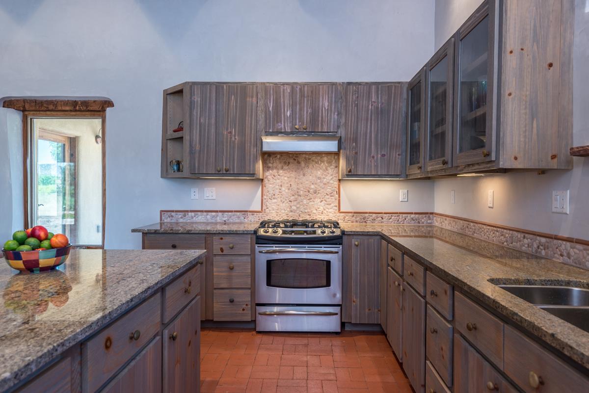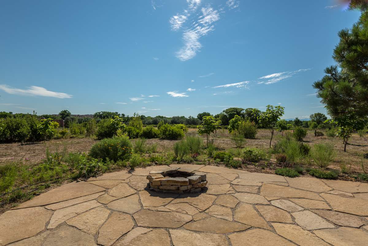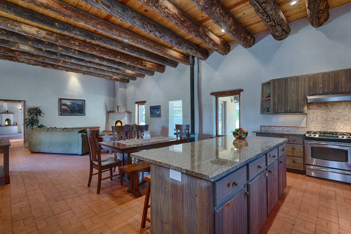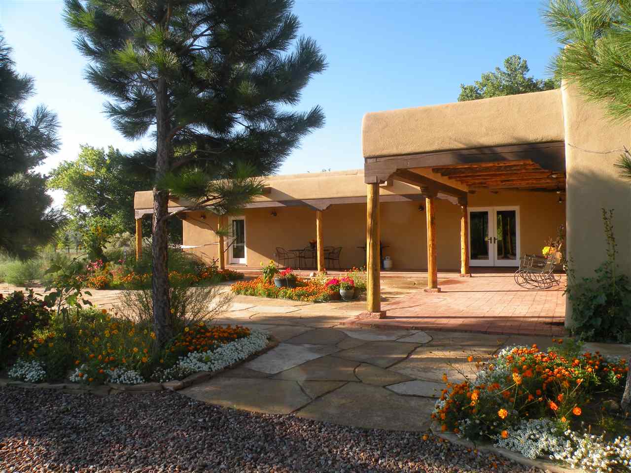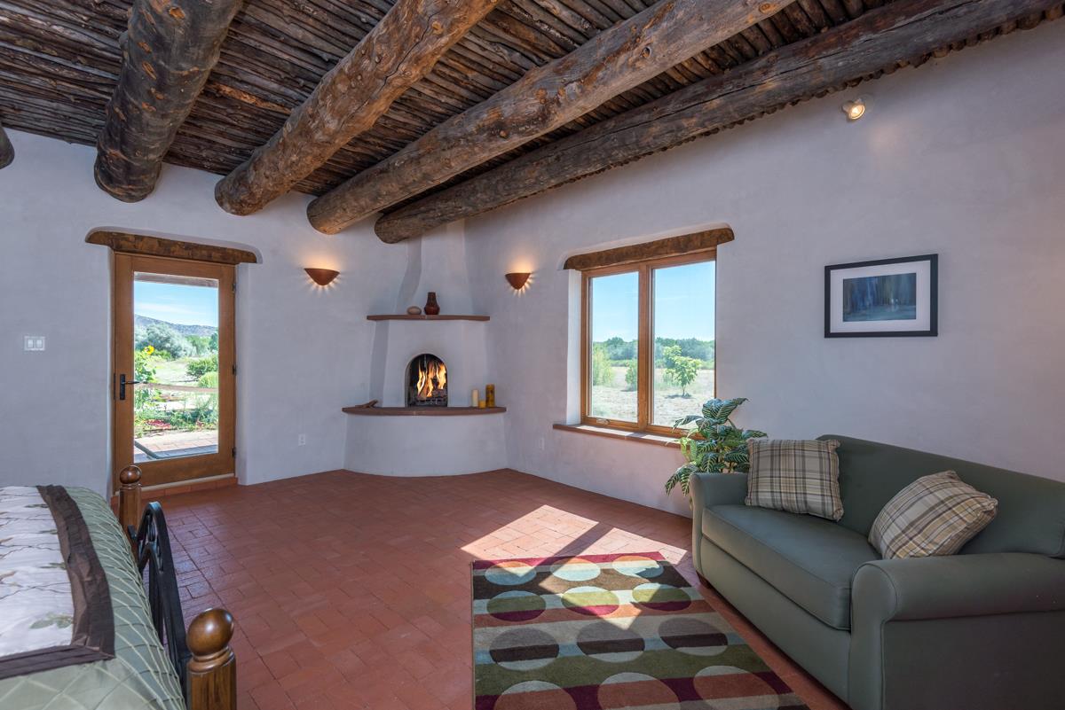 This striking single level Abiquiu residence set on 2.9 acres offers the best of tranquil Northern New Mexico country living, and is perfectly sited to capture views of Sierra Negra and the Sangre de Cristos. The traditional south western design with open concept living features high ceilings with vigas plus easy care brick floors throughout. The graciously sized bedrooms each with its own artistically designed kiva are at opposite ends of the L shaped home. Each room opens onto the sheltered portal for observation of nature and for the enjoyment of outdoor living. The cook's kitchen is complete with granite counter tops, stainless appliances, custom cabinets and spacious island for storage, additional prep surface and informal seating. Other attributes include vineyard with a variety of table and wine grapes, fruit trees, a vegetable garden, mostly on a timed drip system. Lovely gardens with flagstone patio surround the outdoor fire pit. Finished, heated garage could easily be converted to a studio or living space. Surface irrigation rights included. Perfect for entertaining. A fabulous traditional design, yet has all of the conveniences and function of modern technology.