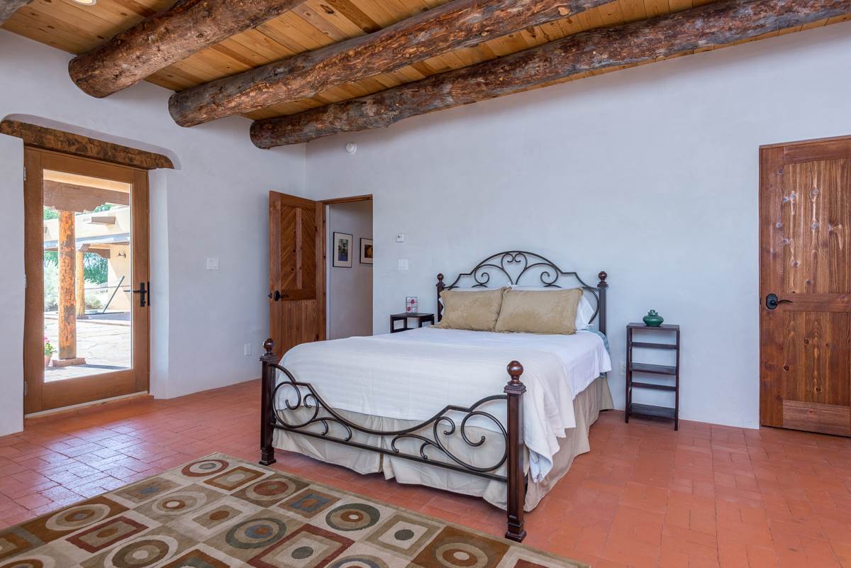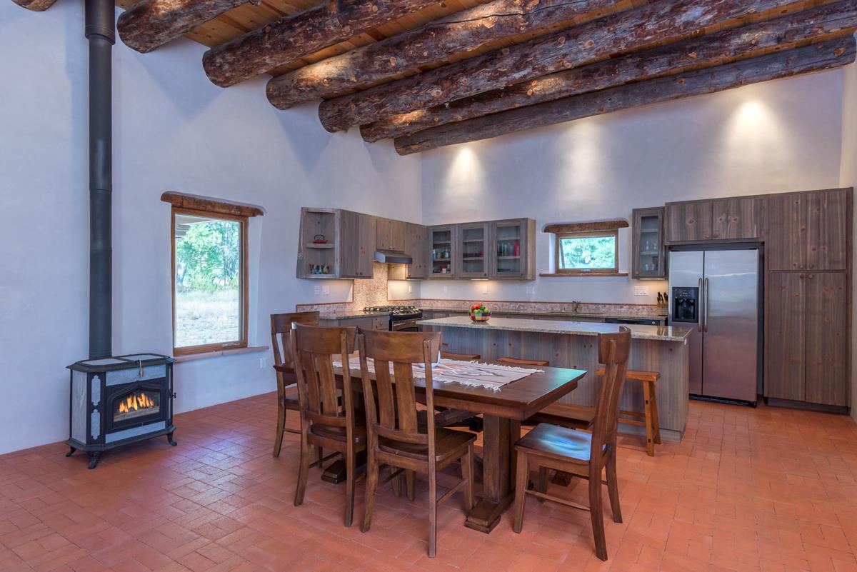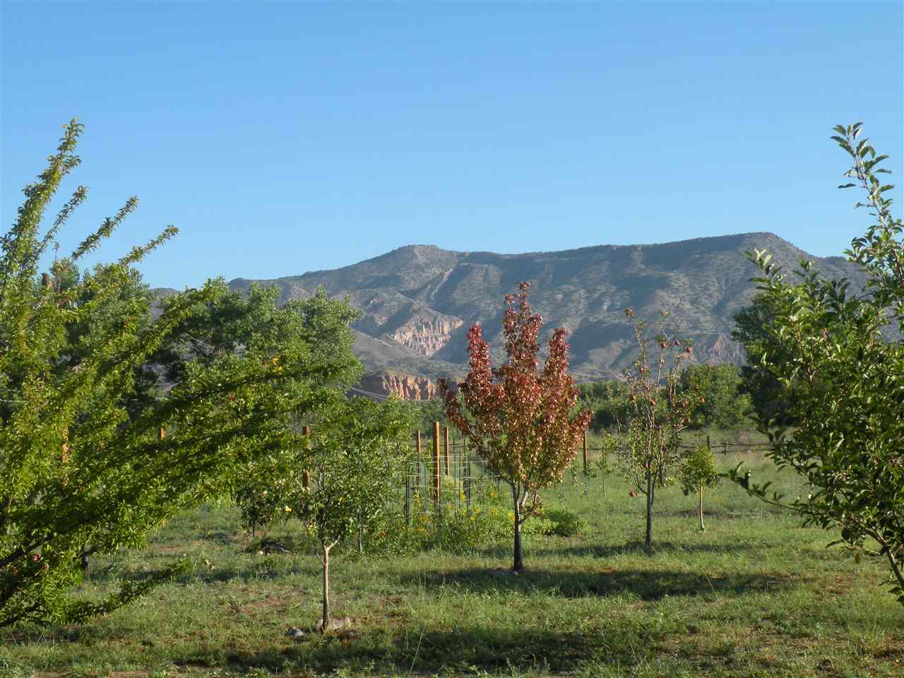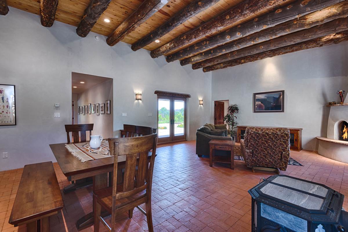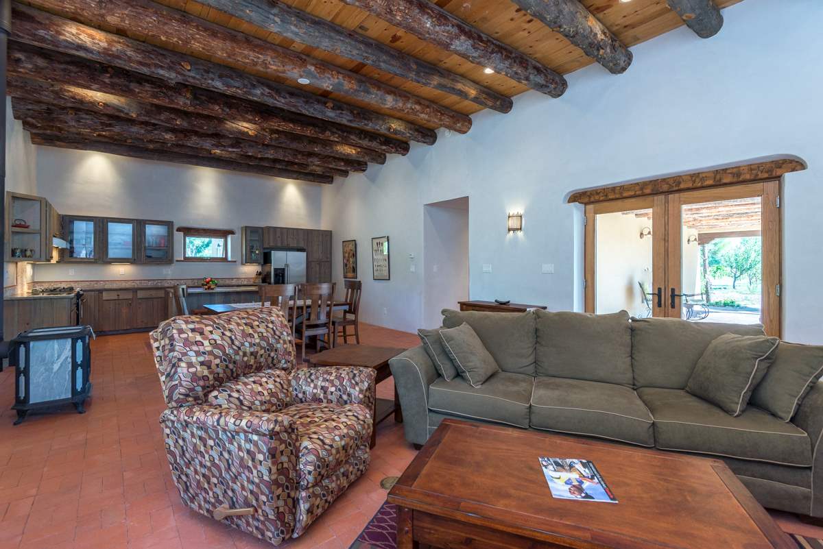 This striking single level Abiquiu residence set on 2.9 acres offers the best of tranquil Northern New Mexico country living, and is perfectly sited to capture views of Sierra Negra and the Sangre de Cristos. The traditional south western design with open concept living features high ceilings with vigas plus easy care brick floors throughout. The graciously sized bedrooms each with its own artistically designed kiva are at opposite ends of the L shaped home. Each room opens onto the sheltered portal for observation of nature and for the enjoyment of outdoor living. The cook's kitchen is complete with granite counter tops, stainless appliances, custom cabinets and spacious island for storage, additional prep surface and informal seating. Other attributes include vineyard with a variety of table and wine grapes, fruit trees, a vegetable garden, mostly on a timed drip system. Lovely gardens with flagstone patio surround the outdoor fire pit. Finished, heated garage could easily be converted to a studio or living space. Surface irrigation rights included. Perfect for entertaining. A fabulous traditional design, yet has all of the conveniences and function of modern technology.