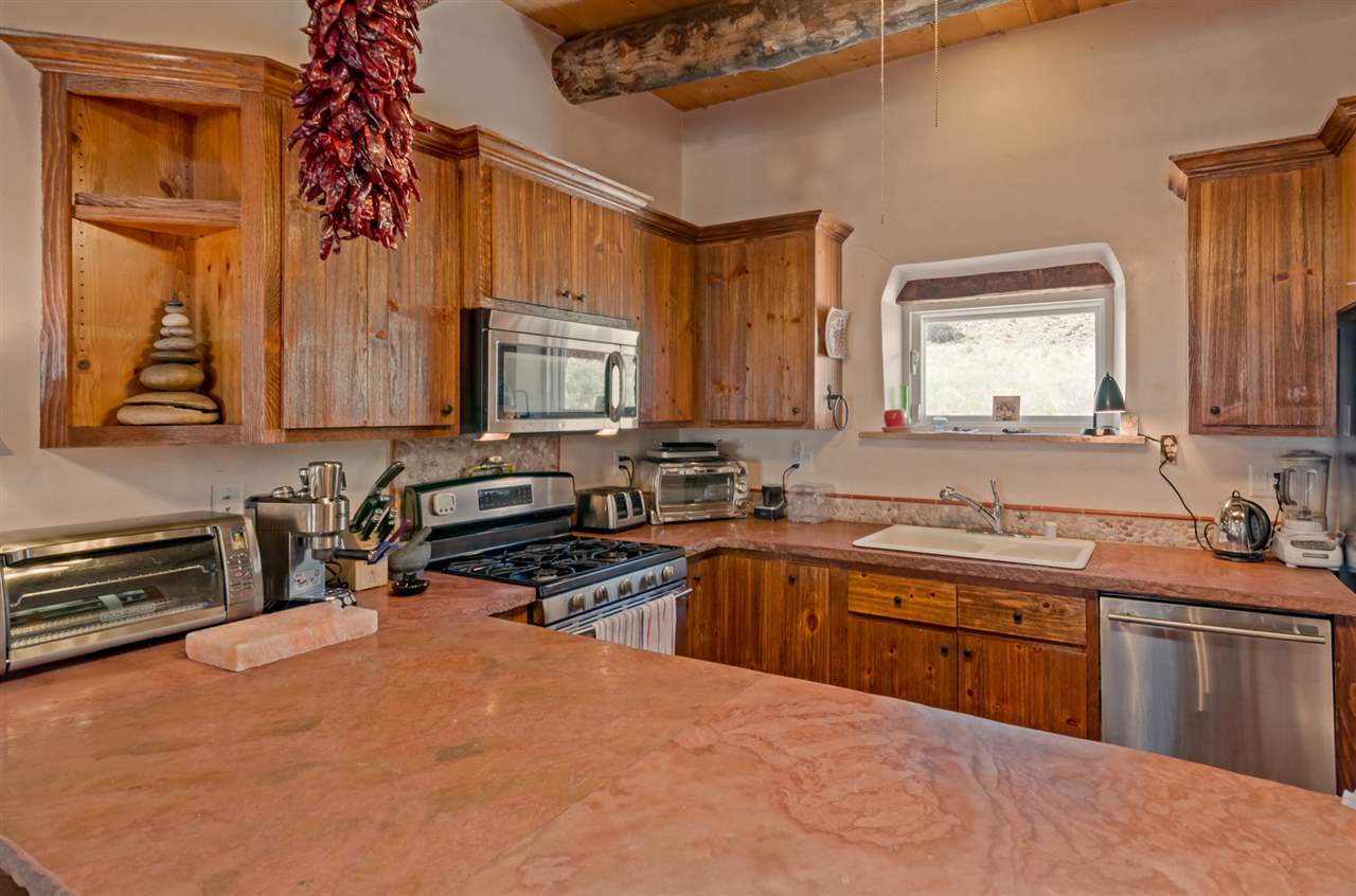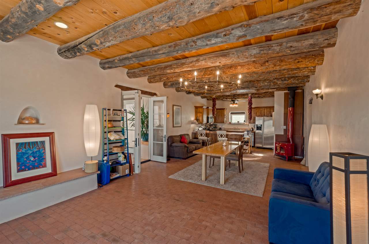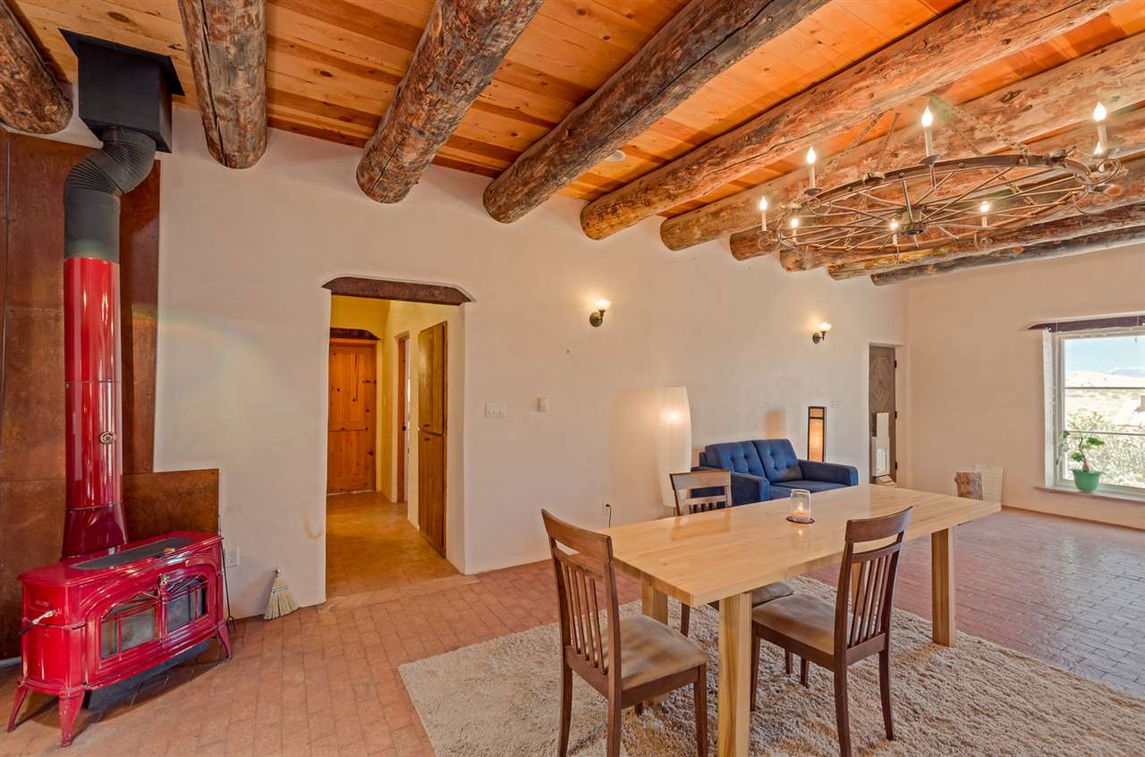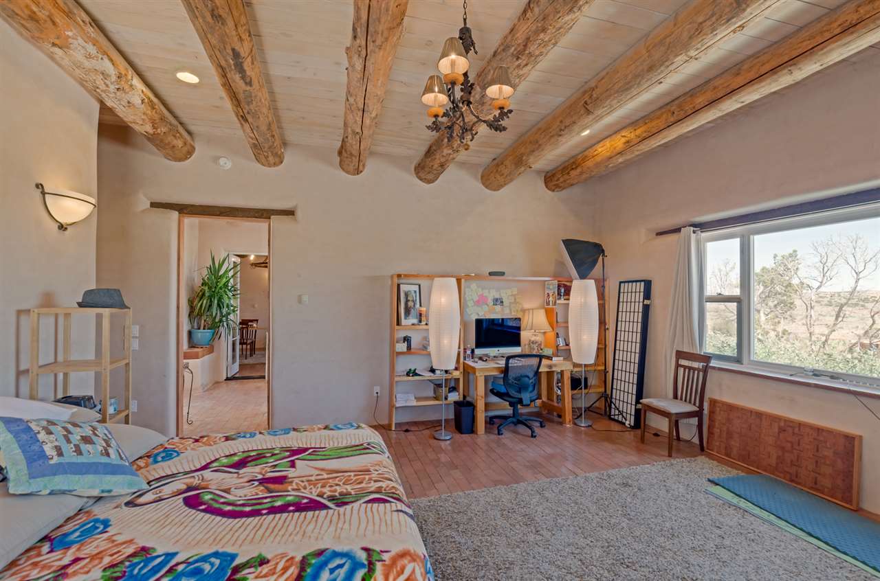 Own this lovely adobe home (2,486 sq ft) on 12.03 acres with landscaping around the house and its own private box canyon that borders the Carson National Forest. This house is classic Northern New Mexico with its rustic vigas, brick floors and beautifully plastered walls. Open living, dining and kitchen area separate the guest bedrooms/bathrooms from the Master Suite creating a great space for entertaining. The wraparound portal looks out toward the Sangre de Cristo and Jemez Mountains and provides a great spot to enjoy the light and beauty that surrounds Abiquiu. There is also a spacious detached garage (600 sq ft) with an additional workshop, a vegetable garden, and an area fenced for horses. So whether you enjoy hiking, riding, or are a lover of beautiful outdoor landscapes, this property is for you.