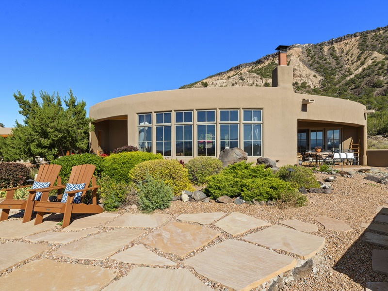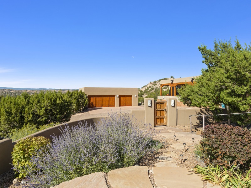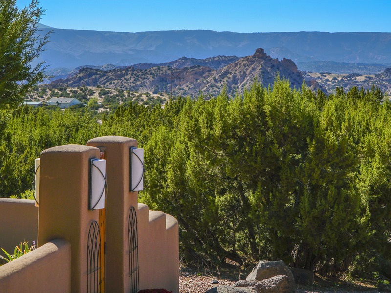A refined and elegant home that is privately sited at the back of a gated community in Ojo Caliente. Large windows allow natural light to warm the plaster walls with color and ambiance. Saltillo floors, vigas, nichos and authentic character are balanced with clean lines and open spaces. Enter the gated patio into a richly, landscaped area that affords the home views of Jemez Mountains and majestic sunsets. Once inside, the recently remodeled gourmet kitchen with entertaining island and large pantry, opens to the great room with kiva fireplace. The 1800 square foot main house enjoys two master suites with views, each with a spa bathroom and generous closets. There is a third bedroom or office with adjacent bath, serving as a powder room as well. The guesthouse is connected by a long portal you can enjoy year-round. Complete with living room, quiet sitting room/office with fireplace, built in shelves and antique doors, kitchenette, bedroom and bath and laundry room; this 1,000 square foot guest house can be used for guests, additional living space or as a rental. Located in the Rio Ojo Caliente Subdivision, this home is being offered with 10 acres and additional 14 acres for maximum sanctuary. The gardens that graciously surround the home include two water features, hardscape and mature plantings, a hot tub and private yoga or rear entertaining deck. Finally, there is an oversized 3-car garage for vehicles, toys or shop space. Come enjoy the true New Mexico dream!