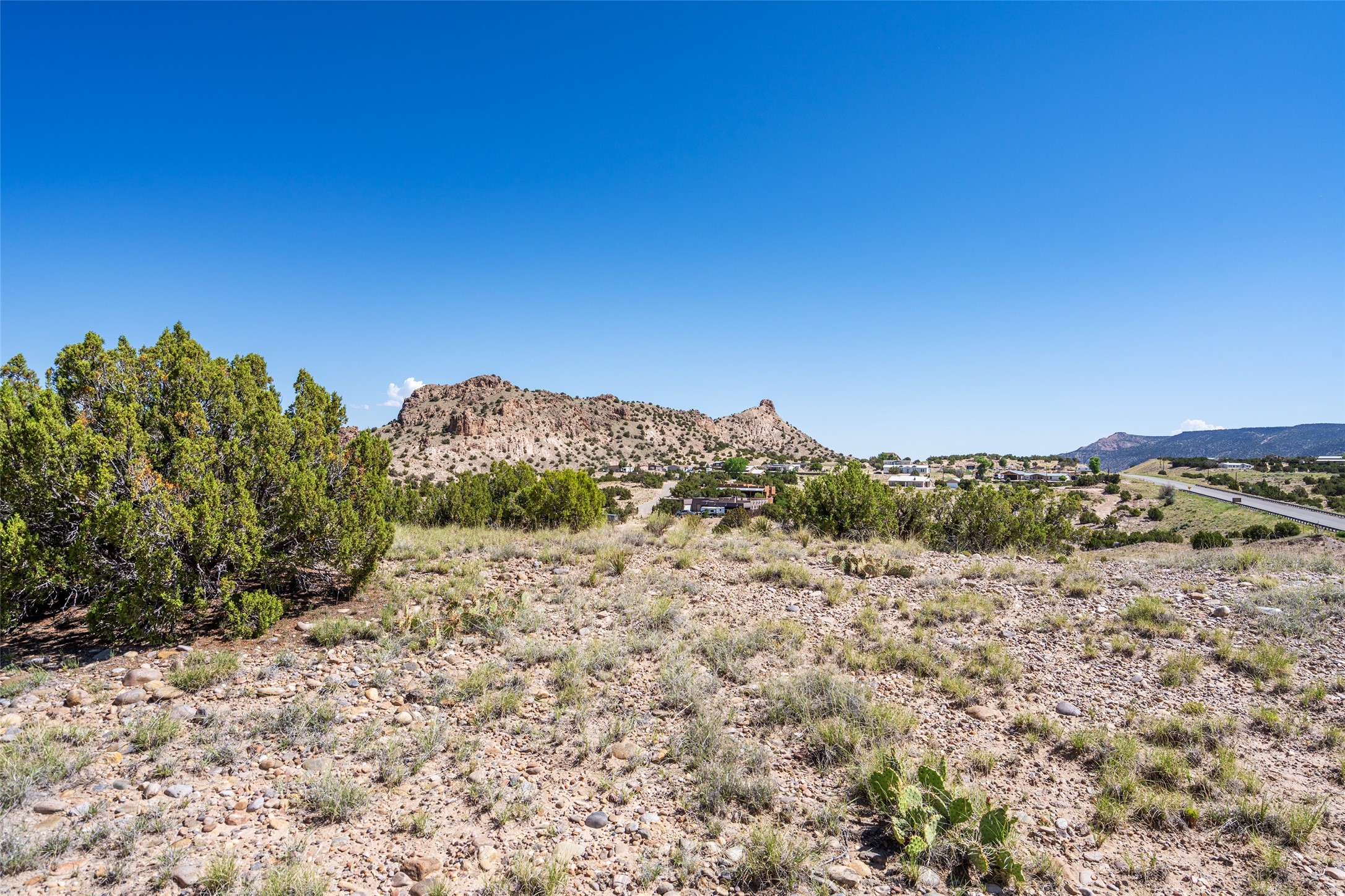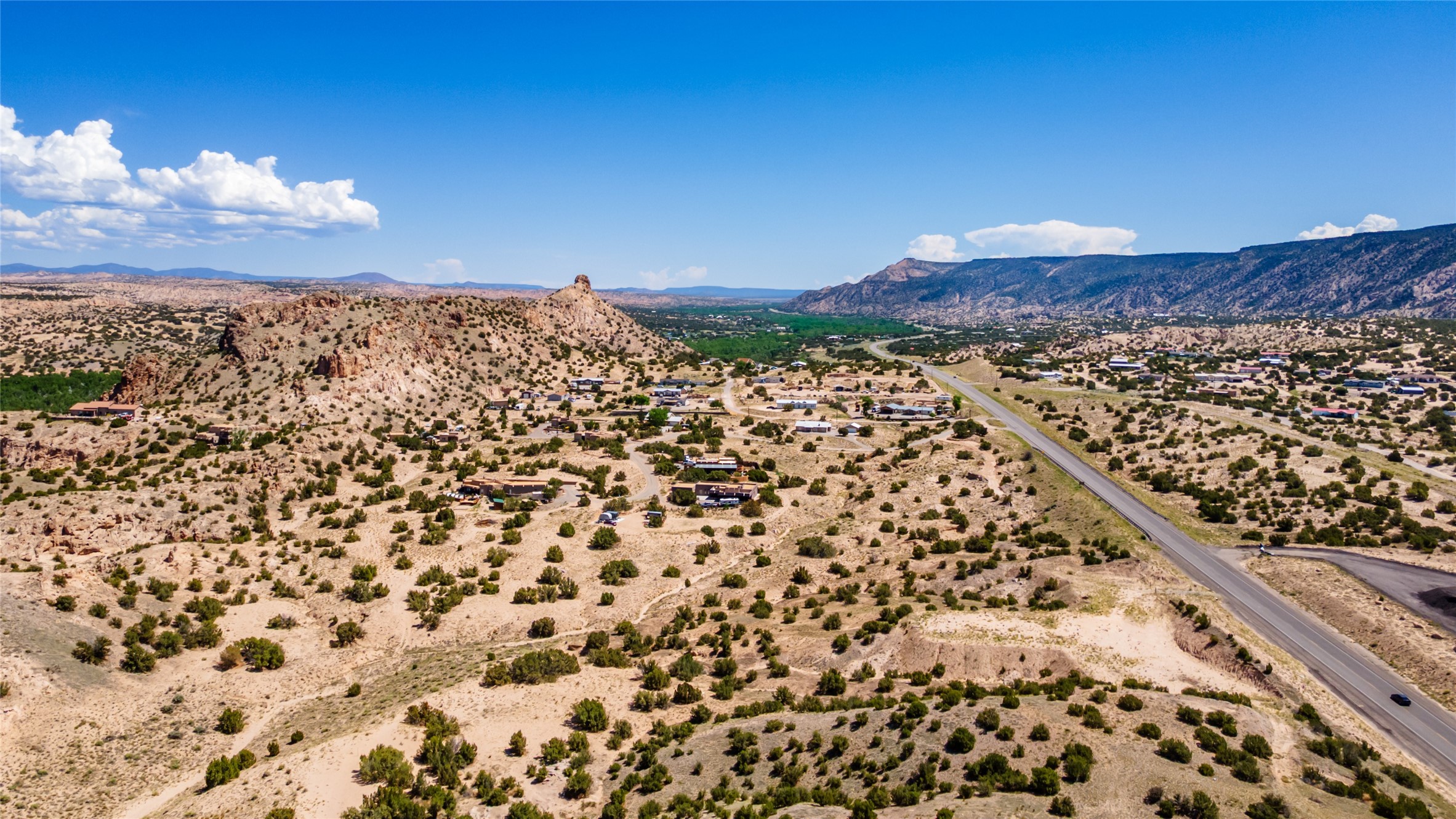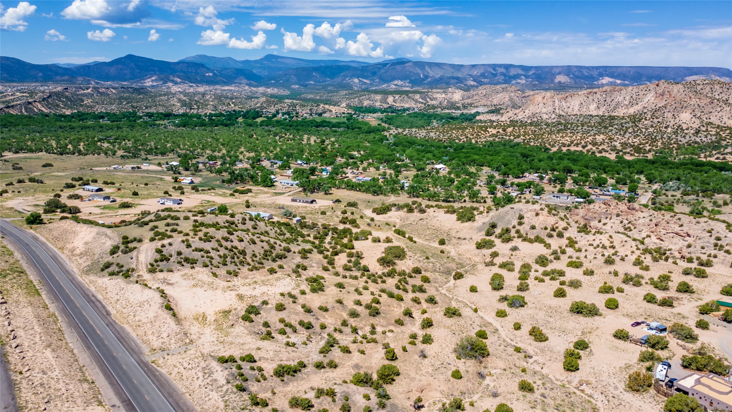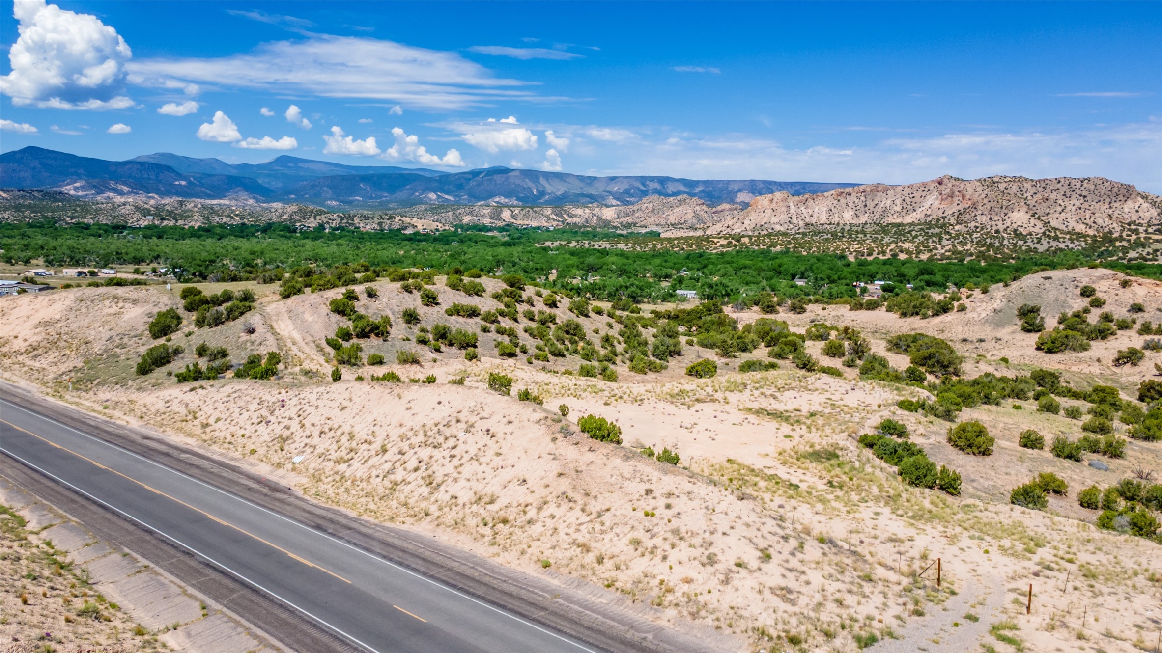 Amazing views without having a bumpy, out of the way trek up a mountain. This kind of opportunity doesn't come very often. Build your dream home, wake up to spectacular sights over the valley, but still have access directly off highway 285, and still feel secluded because of the hills on either side of the entrance which give buffers between home and highway. Perfection! The higher area has already been flattened in preparation for building. This point overlooks arroyos, valleys. and mountain formations. Electricity isn't very far away. Access directly off 285 will make other utilities easier to bring in as well. Not a far commute to Los Alamos. Two lots being sold together for a total of 3.93 acres.